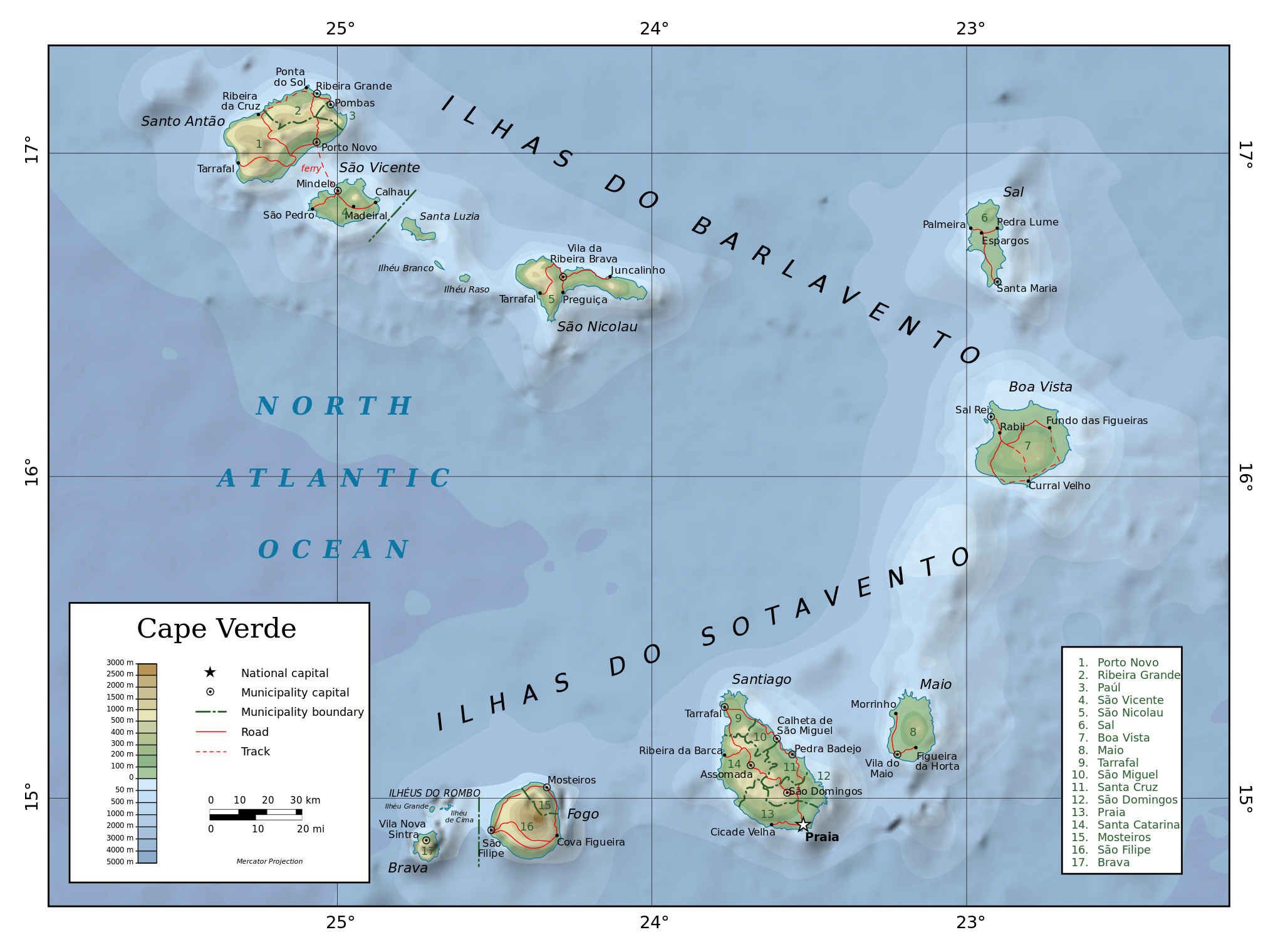 Кабо-Верде – детальная физическая карта. Подробная физическая карта Кабо-Верде.