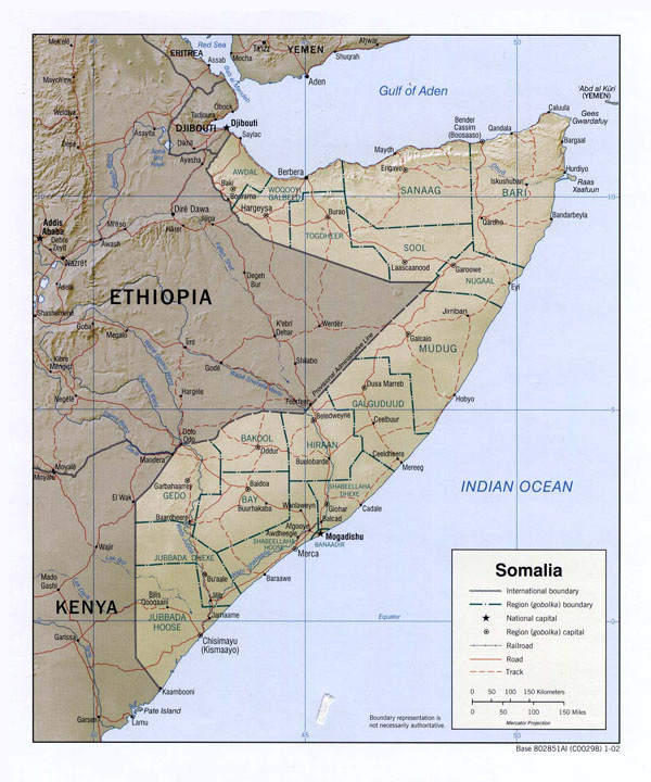 Сомали – детальная рельефная и административная карта. Подробная рельефная и административная карта Сомали.