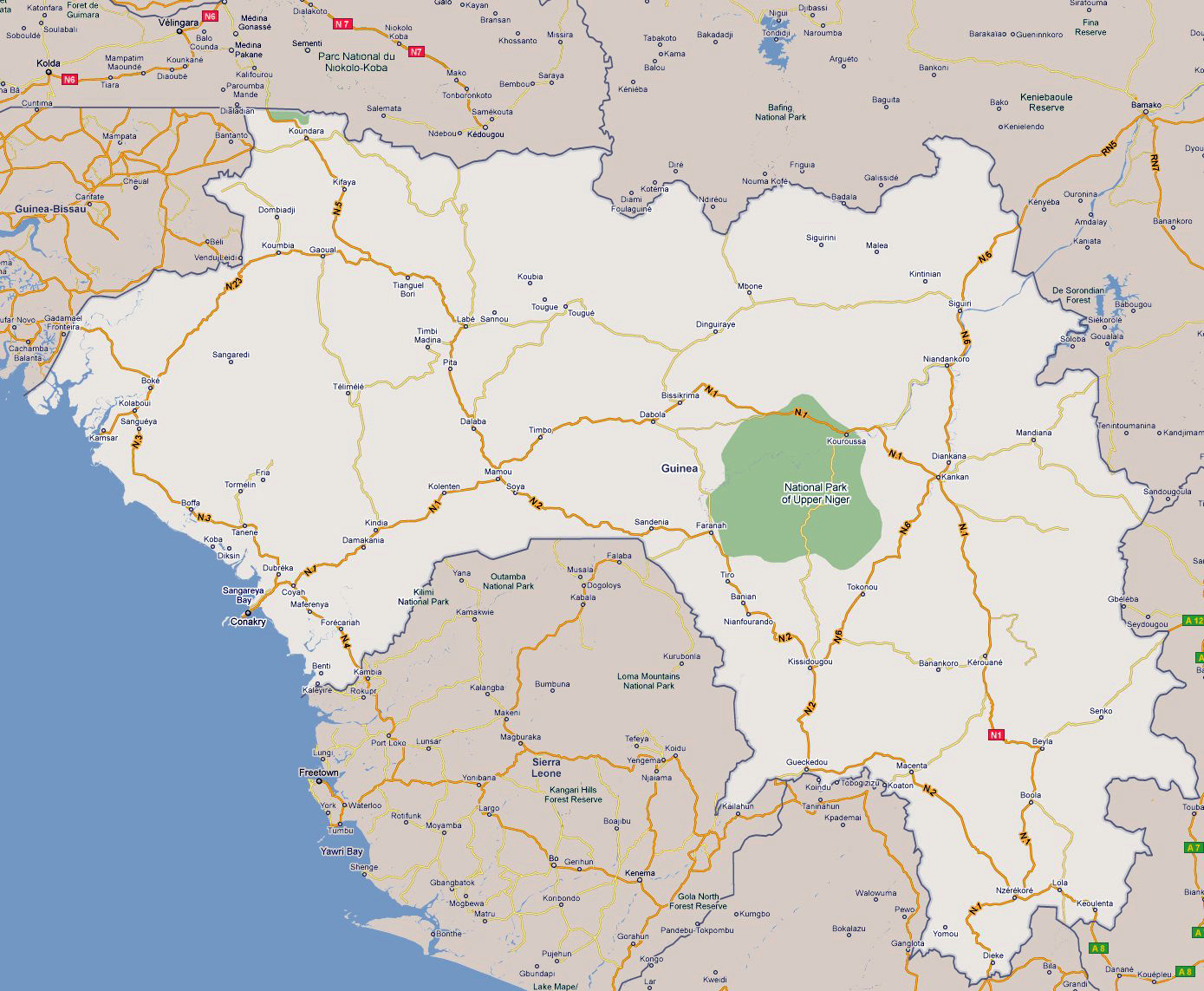 Гвинея – карта автодорог с городами. Автодорожная карта Гвинеи с городами.